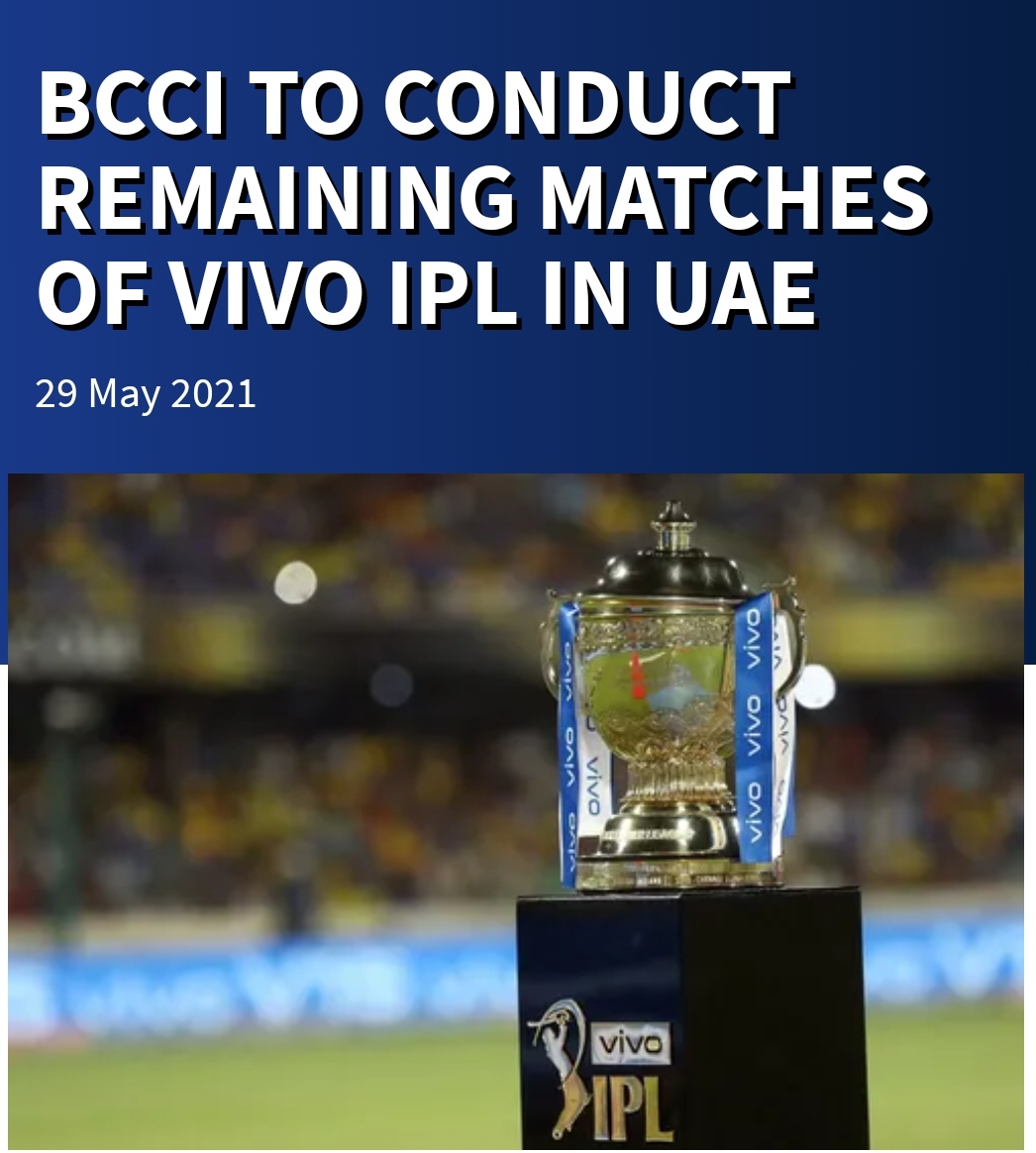 The Board of Control for Cricket in India (BCCI) on Saturday announced to complete the remaining matches of VIVO Indian Premier League 2021 season in the United Arab Emirates (U.A.E) considering the monsoon season in India in the months of September-October this year.